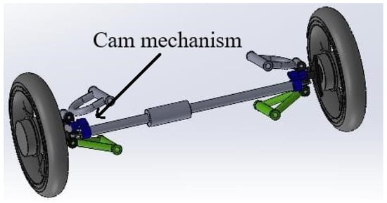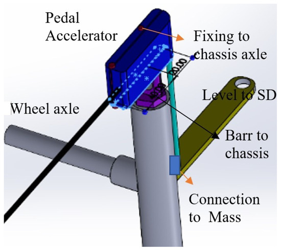 Figure 12 and Figure 13 represent two different schemes of differential accelerators. Figure 12 shows the details of how a part of the accelerator is fixed on the chassis axis and connected to the lever and mass of the tire, which connects to the SD; the hinge part is fixed on the chassis axis 2.5 cm from its end and 3.5 cm from the hinged end. This fixation is due to the fact that the throttle has a smaller opening than the opening of the SD lever arm. Furthermore, the analysis showed that the accelerator does not fully open; according to Table 1, it ranges from 0 to 2 cm. This is less than its maximum opening of 3 cm. On the other hand, the connection of the accelerator with the lever is flexible; that is, it is disconnected when it turns to the opposite side, according to Ackermann geometry. This disconnection is necessary, since it would otherwise break the accelerator that is fixed to the axis of the chassis.