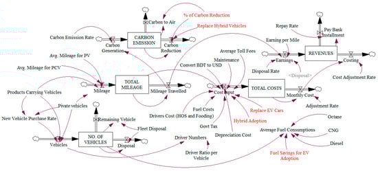 - Case Study Approach [57]: This study considers a case transportation fleet owned by a giant livestock conglomerate in Bangladesh. They have more than 200 vehicles operating nationwide, and this study finds 142 that are used for the supply and distribution of their products. Consequently, a system dynamics simulation model was developed to consider their transport operational data and replicate its current processes. Later, hypothetical values are considered input to understand future transformations in light of key indicators. The case industry is one of the largest farms in terms of producing and transporting day-old chicks, milk, and livestock feed production and marketing of their products all over Bangladesh. Bangladesh is a small country of approximately 95,000 square miles, and the case farm’s vehicles move more than 550,000 miles per month.