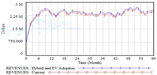 The model’s core components include Carbon Emissions, Total Costs, and Revenues, with feedback loops capturing the impact of variables like mileage, vehicle types, and fuel consumption. For instance, carbon emissions are affected by the total mileage and the adoption of hybrid and EV technologies, which contribute to carbon reduction. Similarly, total costs are influenced by vehicle maintenance, fuel consumption (CNG, diesel, and octane), and toll fees, with potential cost savings achieved through EV adoption. Revenues are determined by operational efficiency, earnings per mile, and cost adjustments. This model serves as a decision-making tool, enabling stakeholders to evaluate the economic feasibility and environmental benefits of transitioning to hybrid and EV fleets. Simulating the effects of replacing fossil-fuel-powered vehicles with sustainable alternatives provides insights into potential cost savings, carbon reduction, and the long-term sustainability of fleet operations. This approach is particularly relevant for industries seeking to balance profitability with environmental responsibility.