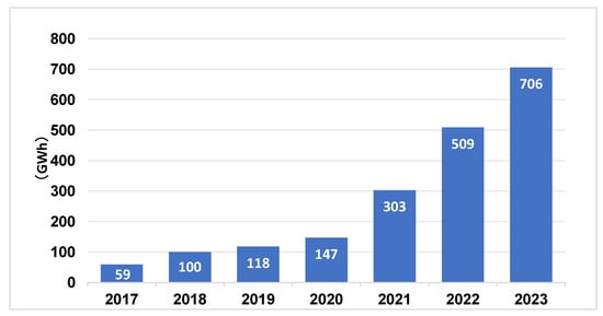 Compared with fossil fuel-based vehicles, the primary difference of NEVs lies in the innovation of their power sources. NEVs no longer rely on fossil fuels but are powered by renewable energy sources such as electricity and hydrogen [6]. Moreover, the three most significant components are the PB, electric motor, and electronic control system, collectively accounting for approximately 50% of the total vehicle cost. Among these, the EVB alone represents about 40% of the vehicle’s cost, making it the highest-value core component [7]. The burgeoning market of NEVs has spurred a significant increase in demand for their core component, PBs. Data from the global consulting firm SNE Research indicate that the global PB installation volume reached 705.5 GWh in 2023, representing a year-on-year growth rate of 38.6%. In parallel, the global market share of Chinese NEV battery manufacturers has risen sharply from 48.8% in 2021 to 63.5% in 2023, as depicted in Figure 1.