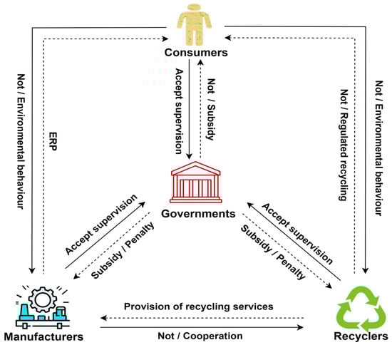 This research focused on the roles of four principal stakeholders in the recycling ecosystem of end-of-life PBs: the government, manufacturers, recyclers, and consumers. As the regulator of the recycling market, the government promotes the fulfillment of environmental responsibilities by all parties through the formulation of reward and punishment policies and the implementation of supervisory mechanisms, without directly engaging in the actual recycling activities. Manufacturers, as battery producers, bear the primary recycling responsibility under the EPR system. Leveraging their advantages in PB production technology and information, they can either establish their own recycling channels or collaborate with recyclers to participate in recycling activities. Recyclers, as professional recycling enterprises, can independently conduct recycling operations based on their technological and network advantages and also provide specialized recycling channel services to manufacturers. Consumers, as the source of the recycling chain, are responsible for delivering spent PBs to recycling outlets, with the extent of their environmental behavior depending on whether recyclers or manufacturers can establish compliant recycling outlets. While the government aims for the public interest, manufacturers and recyclers are profit-oriented. Given that the recycling process requires the consumption of human, material, and financial resources, manufacturers and recyclers weigh the value of actively participating in recycling activities after calculating their net income [74]. Therefore, an intricately designed and efficiently managed recycling system is essential to secure the active participation of all stakeholders in the recycling endeavor. Figure 2 shows the four-party evolutionary game model.