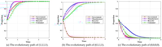 The instability in the collaborative recycling of end-of-life PBs, coupled with the uncertainty surrounding the industry’s future trajectory, has engendered a level of mistrust among the diverse stakeholders involved in the CLSC [72]. In this context, the present study identified the government, manufacturers, recyclers, and consumers as the key stakeholders, positing them as boundedly rational economic agents. Each agent is endowed with the capacity to select from a set of two distinct strategic options, with the implementation of these choices being inherently probabilistic [73]. In pursuit of optimal decision-making regarding the recycling of PBs, participants continually adapt and refine their strategies based on the anticipated strategic behaviors of their counterparts. This dynamic process aims to converge toward an evolutionary stable state, thereby enabling the maximization of individual benefits.