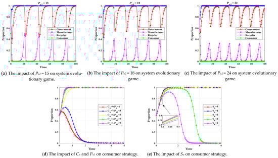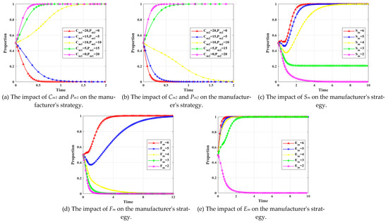 Define . Given that , it follows that is an increasing function with respect to , When , and , is in a stable state. When , , and , is in a stable state. When , , implying and . Under the condition, the manufacturer’s stable strategy cannot be determined, and all are in a stable state. □