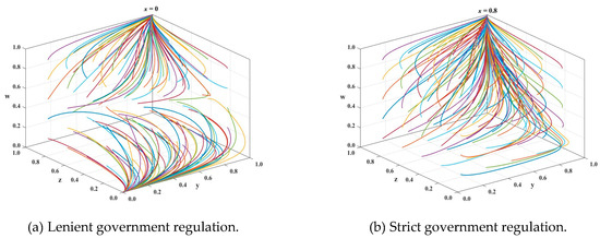 Define Given that , it follows that is an increasing function with respect to w. When , and , is in a stable state. When , , and , is in a stable state. When , , implying and . Under the condition, the government’s stable strategy cannot be determined, and all are in a stable state. □