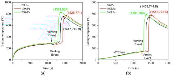 As the tested battery was laterally heated to the TR, it is evident that the battery temperature on the heating side is more sensitive than that on the opposite side. Figure 2 presents the temperature curves on the heating side of the tested batteries under different pressures. For comparison, the moment when the heating plate was activated was set to t = 0 s. Approximately 20 min elapsed before the venting event occurred. The tested battery under 260 kPa reached the maximum temperature (827 °C) of the TR at t = 1381 s, while the maximum temperature of the tested battery under 100 kPa achieved the lowest value (749.9 °C) at t = 1447 s. The maximum temperature shows a positive correlation with ambient pressure, suggesting that a higher pressure results in a more violent TR, consistent with the previous results [18]. Compared with the case at 20 kPa, although the tested battery under 100 kPa achieved the maximum temperature at the latest, the maximum temperature was elevated. Meanwhile, the onset of the venting event under 20 kPa was significantly earlier than the other two cases. Hence, it may imply that the lower burst pressure of the safety valve can mitigate the hazards of the TR and provide earlier warning signals, such as characteristic gases. However, the internal pressure of the examined battery will increase to a certain degree during normal cycles. As a consequence, an optimal value of the burst pressure should exist in terms of early warning and hazard prevention for the TR.