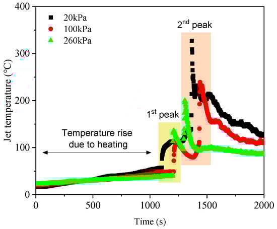 Figure 3 illustrates the variations of jet temperature approximately 30 mm above the safety valve under different pressures. It is worth noting that it is difficult to avoid measurement errors as a result of the location of the measurement point and the heat capacity of the TCs. For the case at 20 kPa, jet temperature was first detected at t = 1105 s and reached the first peak (113.5 °C) at t = 1194 s and the second peak (309.2 °C) at t = 1368 s. For the case at 100 kPa, the jet flow appeared at t = 1209 s and its temperature reached the first peak (107.7 °C) at t = 1237 s and the second peak (239.4 °C) at t = 1440 s; for the case at 260 kPa, the significant rise in jet temperature appeared at t = 1201 s and reached the first peak (135.8 °C) at t = 1209 s and the second peak (200.2 °C) at t = 1305 s. It seems that the maximum jet temperature decreases with the elevated ambient pressures. The reason why all cases exhibited two peaks in the jet temperature curves was that two ejections occurred during the venting process. During the first ejection, the saturated vapor pressure of electrolyte contributed the most, but TR was not triggered. With the elevated battery temperature, the main triggering reactions commenced and released a great number of gases; thus, the second ejection took place. The time interval between the second peak and the onset of the jet was employed to describe the response time, which varied conversely with the ambient pressure, namely 263 s under 20 kPa, 231 s under 100 kPa and 104 s under 260 kPa. The variations of jet temperature implied an earlier warning and a longer response time under a lower pressure. Characteristic temperatures of the tested battery and the jet during the TR are listed in Table 2.