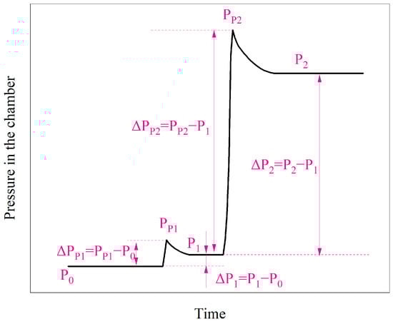 The pressure variations in the sealed chamber represent the intensity of the venting process to a degree. Figure 4 illustrates the diagrammatic sketch of a typical pressure curve of the examined batteries and defines several parameters to describe the whole venting process from the aspect of pressure variations inside the chamber. Prior to the opening of the safety valve, the pressure within the chamber is approximately equal to the initial pressure, P 0 . Similar to Figure 3, there are two pressure peaks, namely P P 1 and P P 2 , which may result from the dynamic pressure and the rapid cooling. After each pressure peak, the pressure inside the chamber gradually approaches a constant value, P 1 and P 2 . The pressure variation between the peak pressure and the onset pressure is defined as the pressure impact to represent the venting intensity, such as P P 1 and P P 2 . Two parameters calculated at the stable stage, P 1 and P 2 , are positively correlated with the amount of gas released and represent the pressure effects of each venting process.
