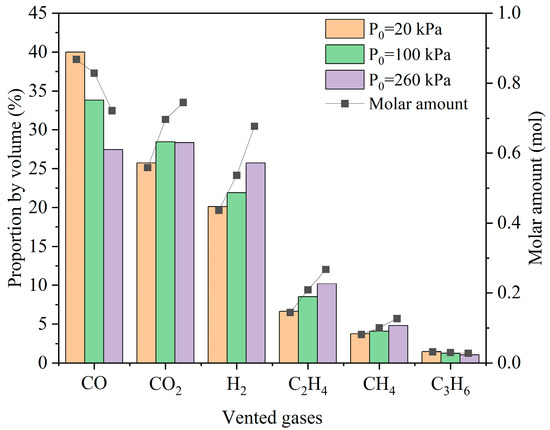 Figure 8 gives the compositions and molar amount of the vented gases under different ambient pressures. In total, the six most common gas species, accounting for more than 1% by volume, were detected in all cases, including CO, CO2, H2, C2H4, CH4, and C3H6, according to the order of proportion. As for the proportion by volume of the main vented gases, CO and C3H6 are negatively correlated with ambient pressure, while CO2, H2, C2H4, and CH4 present a positive correlation with ambient pressure. There are significant changes in the gas proportion of CO and H2. The molar amount which can be expressed by the product of the gas proportion and the total gas amount reflects the absolute content of each gas species, showing a consistent trend with the gas proportion. The content of CO2 presents a strongly positive correlation with ambient pressure as the total gas amount increases. Meanwhile, there is a drop in the ratio of CO to CO2, implying that the redox reactions among battery materials during TR are more complete under a higher ambient pressure. This can be attributed to the increased ejections of reactants under a lower pressure. On the whole, by adjusting ambient pressure, the main components of the vented gases can hardly change, while the relative proportion and absolute content of these gases significantly dissimilate. For instance, the concentration of CO drops by 12.6% (0.15 mol), while that of H2 increases by 5.6% (0.24 mol).