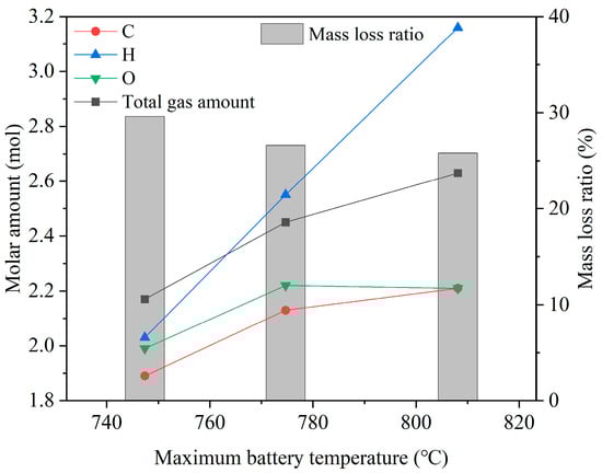 The vented emissions are mainly composed of gases, particles, and liquid electrolyte or its reaction products (if any), which contributes to the mass loss together during the process of TR. In this study, gaseous emissions were mainly focused on. The total gas amount, the total mass loss and the total elemental contents of C, H and O are the overall parameters to characterize the gas venting event. Maximum battery temperature as a variable was recalculated by the average of the battery temperature, and 747.4 °C, 774.7 °C, and 808.1 °C were obtained for 20 kPa, 100 kPa, and 260 kPa, respectively, showing a strongly positive relation with ambient pressure. Figure 9 illustrates the influence of maximum battery temperature on the above parameters. The horizontal axis represents the average of the maximum temperatures for both sides of the tested battery. The mass loss varies inversely with the maximum battery temperature, while the total gas amount increases obviously with the maximum battery temperature from 2.15, 2.43 to 2.64 mol. Figure 3 points out that there are two ejections during the process of TR for each tested battery. Each ejection is made up of a fast ejection and a subsequently continuous stream. Under a lower ambient pressure, the earlier opening of the safety valve allows more liquid electrolyte to be ejected out of the tested battery during the first ejection before the TR. Under 260 kPa, the duration of the first ejection was relatively insufficient, which could explain the decrease in the mass loss ratio. Meanwhile, the total gas amount can describe the intensity of TR to some extent, satisfying the positive relation. All the most common gas species are composed of C, H and O, and the molar amount of these elements shown in Figure 9 was calculated by the detected compositions in Figure 8. Element H significantly increases with ambient pressure, potentially implying that more decomposition reactions occur under an elevated ambient pressure because of a relatively long period prior to the onset of the safety valve. Furthermore, C and O show a weakly positive trend with the maximum battery temperature as a consequence of the increasing total gas amount. The average molar weight of the vented gases, defined as the proportion of the gas mass to the gas molar amount, also represents the degree of decomposition during the whole TR process, 26.30, 26.18, and 24.64 g/mol, respectively, with the increase in the maximum battery temperature, signifying more thorough reactions during the TR process. In other words, under a lower ambient pressure or for a lower burst pressure of the safety valve, some reactants are released from the tested battery at the initial stage prior to the TR; hence, less energy is released in a series of exothermic reactions, mitigating the intensity of the TR. However, more attention should be paid to the remaining battery materials and the vented emissions in order to prevent further energy release.