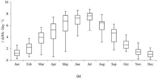 Additionally, the distribution of daily energy generation across different months is presented to highlight seasonal variations. The ambulance and truck were analyzed under average conditions for Rome in Figure 6, which exhibited a relatively typical energy generation profile based on the obtained results. Figure 6a illustrates the results for the ambulance with . It is important to note that for both the truck and ambulance, the presented results correspond to .