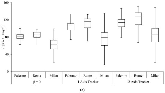 For the container and mobile operating room, the minimum daily energy production in July and December is shown in Figure 12c, considering three different configurations: a fixed installation with zero inclination and systems with solar tracking. In July, the results indicated that these case studies could fully meet their energy demands, with production ranging from 3 to 60 times the required energy. However, in December, accounting for the energy consumption of tracking systems, some cases in Milan and Rome showed instances where net energy production was close to zero when two-axis trackers were used. On other days, when a two-axis tracker was used, the average energy produced by the container in Milan and Rome was 9.3 and 14.11 , respectively.