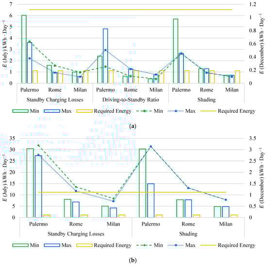 For both the ambulance and the truck, the terms “Max” and “Min” in the figures represent the energy production corresponding to the maximum and minimum values of a given parameter. For instance, in the case of standby charging losses (), the maximum and minimum values were set at 700 and 0 , respectively. All other conditions and parameters were kept consistent with those outlined for obtaining the values in Table 5. Although the VIPV system may not always provide sufficient energy to power all medical devices for an entire day, it can still supply energy for durations ranging from 1 to 15 h, even under the lowest production conditions. Additionally, the average energy production across the analyzed months was significantly higher than these minimum values. For instance, in July, although daily energy production in Milan and Rome sometimes fell below the required energy at certain times, the average generated energy consistently exceeded the required amount.
