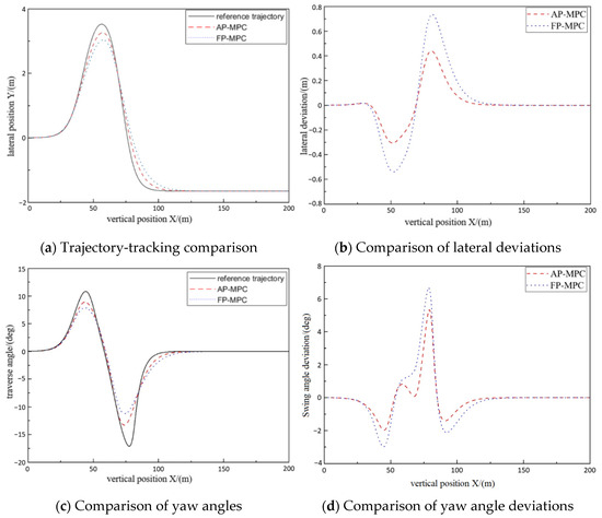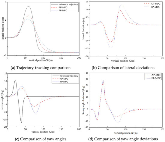 From Figure 10 and Figure 11, it is easy to see that the trajectory-tracking effect of the AP-MPC controller is better than that of the FP-MPC controller under different speed conditions. When the target speed is 50 km/h, the maximum traverse angle deviation of FP-MPC controller is 6.66°, and the measured simulation computation time is 9.17 s, while the maximum traverse angle deviation of AP-MPC controller is 5.33° and the measured simulation computation time is 7.79 s, which indicates an improvement in the control accuracy of 19.9% and the controller solution speed by 15%, and the maximum traverse deviation, traverse angle deviation, and the maximum traverse angle deviation of AP-MPC controller is 5.33° and the measured simulation computation time is 7.79 s. The control accuracy is improved by 19.9%, and the controller solution speed by 15%. The maximum lateral deviation and the oscillation amplitude of the transverse pendulum angle of the controller are smaller than those of the FP-MPC controller. When the speed reaches 100 km/h, the AP-MPC controller effectively reduces the overshooting amount of the trajectory-tracking control, and its maximum traverse angle deviation and maximum lateral deviation are reduced by 0.5% and 26.9%, respectively, compared with those of the timing-domain controller. This shows that under high-speed driving conditions, the AP-MPC controller has better control effects and higher vehicle stability.