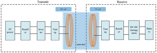 With the continuous development of marine science and technology, the demand for marine exploration, seabed resource development, and environmental monitoring is increasing. In the marine environment, numerical equipment such as underwater robots, detectors, and sensors needs to work underwater for a long time. This equipment usually undertakes tasks such as data acquisition, real-time monitoring, and complex operations, which require a long-term and stable power supply. However, due to the particularity of the deep-sea environment, the traditional power supply mode faces many restrictions. For example, the battery has limited energy and needs to be replaced frequently, which will not only interrupt the continuous operation of the equipment but also lead to the interruption of tasks and the reduction of work efficiency. In addition, the high corrosivity in the marine environment and complicated water flow conditions make the traditional online charging method face serious security risks, such as loopholes, electric shocks, and other risk problems. In order to solve the above problems and improve the working efficiency of underwater equipment, wireless charging technology in seawater environments came into being [1,2]. Wireless power transmission transmits electric energy through indirect contact, which is especially suitable for the power supply demand of underwater equipment. When it is applied to the power supply of underwater equipment, it can improve the continuous operation ability of the equipment, ensure the stability and safety of the energy supply, and facilitate the orderly progress of underwater operation [3,4,5,6].
