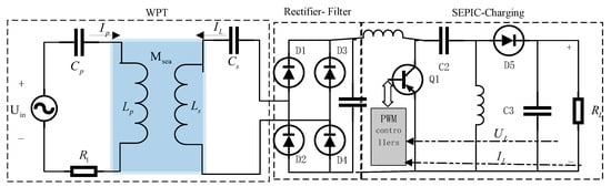 In this study, the circuit of the wireless charging system consists of three parts: a wireless power transmission module, a rectifier filter module, and a charging control module based on SEPIC topology. As shown in Figure 2, the wireless power transmission module adopts an S-S topology, which has the advantages of a simple structure, strong load capacity, and long transmission distance. The rectifier and filter module select a full-bridge rectifier circuit, whose main function is to rectify and filter the high-frequency alternating current received by the secondary coil so as to provide stable direct current for the subsequent SEPIC circuit. Finally, through the combination of SEPIC topology and PWM controller, the output current and voltage can be adjusted to meet the constant current and constant voltage charging requirements of the system.