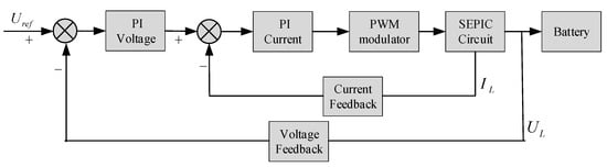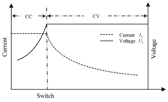 It can be seen from Equations (11) and (12) that the purpose of adjusting the output charging current and voltage can be achieved by adjusting the PWM duty ratio of the SEPIC converter. The double closed-loop control of constant current and constant voltage is shown in Figure 3. The two loops work together to provide closed-loop control of current and voltage during the constant current and constant voltage charging stages, respectively. In the early charging stage, the system runs in constant current mode, the current loop dominates, and the voltage loop outputs voltage in the late charging stage. When the output voltage is close to the set constant voltage value, the system switches to constant voltage mode. At this time, the voltage loop dominates, and the current loop monitors the output current. Figure 4 shows the schematic diagram of constant current and constant voltage charging.