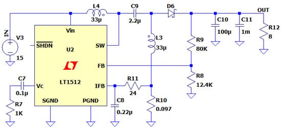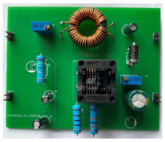 In this study, the LT1512 chip is selected as the wireless CC-CV charge controller, combined with the SEPIC topology design, to achieve stable and accurate battery charging control. As shown in Figure 5 for the LT1512 chip external circuit, in addition to the traditional voltage feedback node, it also has a current detection feedback circuit for precise control of the output current of the charger with SEPIC topology. The current detection circuit takes ground as the reference potential and is completely isolated from the battery itself, thus effectively simplifying battery switching operation and system grounding issues. This design not only enhances system stability but also improves the reliability of the charging process. In addition, the topology allows for charging operations even when the input voltage is lower than the battery voltage, up to 30 V. This makes it ideal for charging control in the back end of a WPT system, which is able to cope with a wide range of power transmission environments and system stability requirements. Figure 6 shows the charging control board made for the wireless charging system.