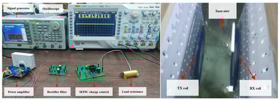 In order to verify the charging performance of the system in seawater, an underwater experimental platform is built, as shown in Figure 7. The wireless charging system mainly includes two parts: transmitter and receiver. The transmit end consists of a signal generator, a pow amplifier, a primary compensation circuit based on an S-S topology, and a transmitting coil. The receiver consists of a secondary compensation circuit based on an S-S topology, receiving coil, rectifier circuit, and SEPIC converter. The transmitting and receiving coils are both 17-turn planar spiral coils wound by AWG16 wires with a diameter of 2.1 mm. The rectifier and filter circuit adopt a C3D06060 diode and 470 μF aluminum electrolytic capacitor. The SEPIC controller selects the LT1512 chip, which is responsible for sampling the output current and voltage and achieving the control of constant current and constant voltage charging. The water tank (size: 120 cm × 70 cm × 70 cm) used in the experiment is filled with seawater dissolved by water and sea salt, with a salinity of 3.5%. The conductivity of seawater is measured by a conductivity meter (Lichen Bangxi: LCDDB 1A, Shanghai, China) and adjusted to simulate the actual seawater environment. The measured conductivity is about 3.41 S/m, and the detailed system parameters are listed in Table 3. The connections of the experimental setup are shown in Figure 8.