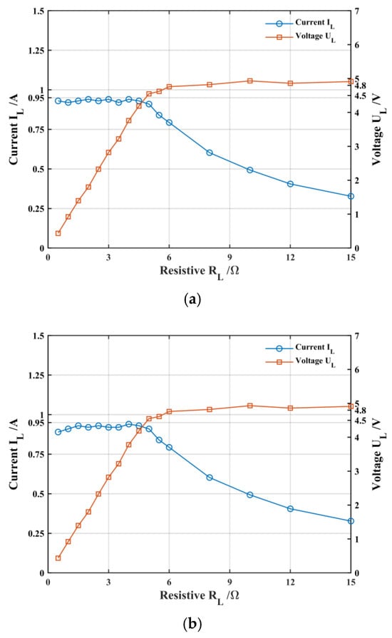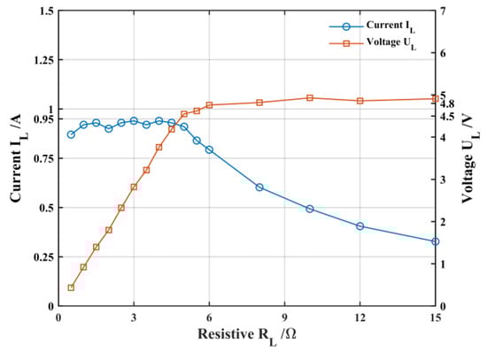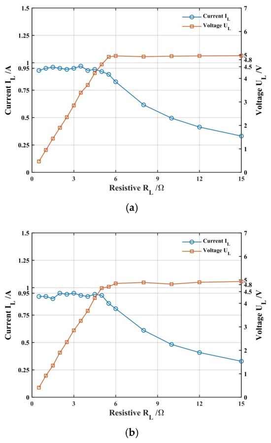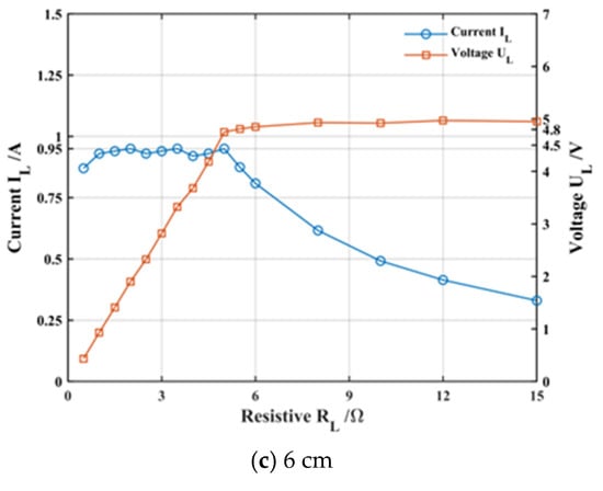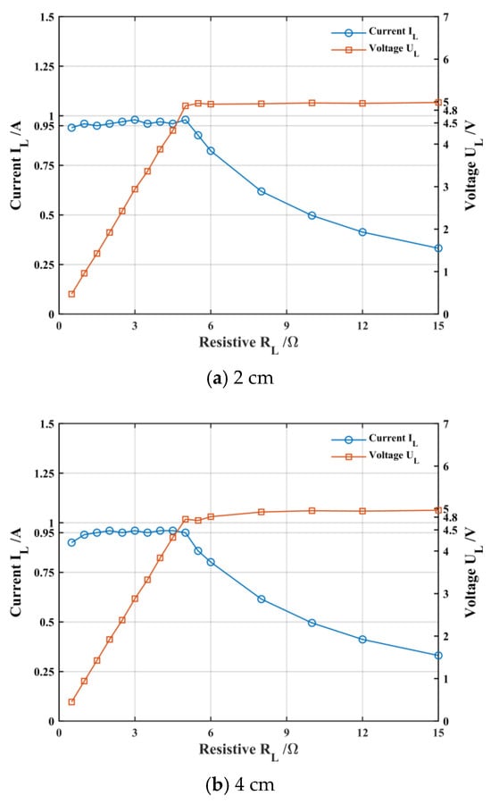 Subsequently, the constant current and constant voltage values of charging were set, where the charging current in the constant current charging stage was set to = 1 A and the charging voltage in the constant voltage stage was set to = 5 V. The charging performance of the system at different distances was tested, and the changes in the charging current and charging voltage with load resistance were recorded in the experiment. As shown in Figure 9, the charging current can be stabilized at 1 A in the constant current stage at the initial stage of charging. In the constant voltage stage, the charging voltage can be maintained at 5 V. At the same time, the system can achieve the correct switching between constant current and constant voltage, and the system can achieve the function of wireless charging.