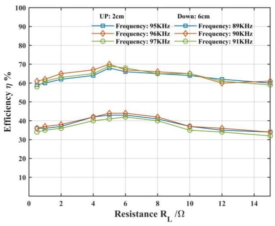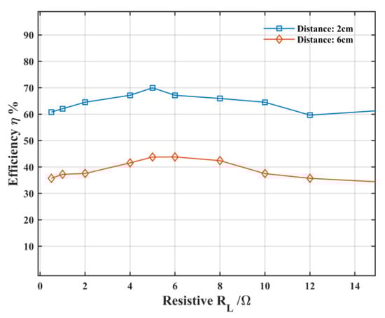 Taking a short distance of 2 cm and a long distance of 6 cm as examples, the transmission efficiency of the WPT system is calculated as shown in Figure 10. When the transmission distance is 2 cm, the transmission efficiency ranges from 60% to 70%, while at a transmission distance of 6 cm, the transmission efficiency range decreases from 32% to 44%, and this significant decrease indicates that the transmission distance has a significant effect on the transmission efficiency of the system. This trend is consistent with the pattern of variation of coil mutual inductance values with transmission distance shown in Table 4. With the increase in transmission distance, the mutual inductance between coils decreases significantly, which leads to a decrease in energy coupling efficiency.