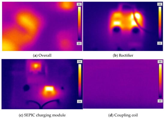 Figure 15 illustrates the overall thermal distribution of the wireless charging system, including the power amplifier, rectifier, SEPIC charging management module, and coupling coils measured by a thermal infrared imager (CHAUVIN ARNOUX: CA75). As observed in the thermal imaging results, the power amplifier on the left side of Figure 15a exhibits the highest temperature rise, indicating significant power losses during high-frequency operation, primarily due to switching and conduction losses. Additionally, the heat concentration in the rectifier is mainly observed around the four diodes, suggesting that forward conduction losses and reverse recovery losses significantly impact the overall system efficiency. Similarly, the diodes in the SEPIC charging management module show noticeable heat accumulation. No localized overheating was observed in the coils, mainly due to the good thermal conductivity of seawater, which facilitates rapid heat dissipation and prevents the formation of localized hot spots.