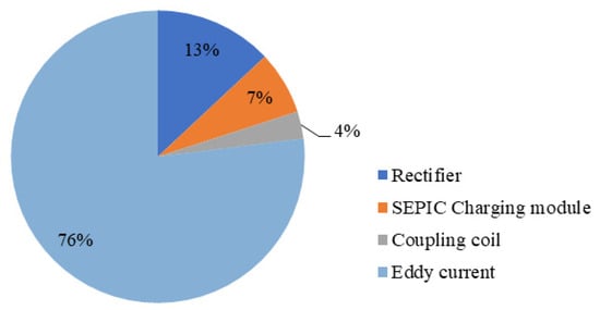 The power losses of the modules are obtained by measuring their input and output voltage drops and currents, and the percentage of the power losses of each module in the total losses is shown in Figure 16, where the power losses of the rectifier account for about 13%, and the SEPIC charge control module accounts for about 7%. In the future, more efficient power components, synchronous rectification, and the replacement of conventional diodes with MOSFETs can be selected to reduce reverse recovery losses and improve rectification efficiency.