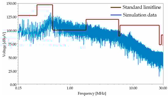 To perform the simulation of conducted interference voltage in the EDS, an integrated simulation model for the multi-in-one EDS is established, as shown in Figure 1. The simulation results of the conducted interference voltage obtained from this model exhibit good consistency with the measured data, thereby validating the reliability of the model [1]. Based on this model, the conducted emission voltage without filtering is calculated, as depicted in Figure 2.