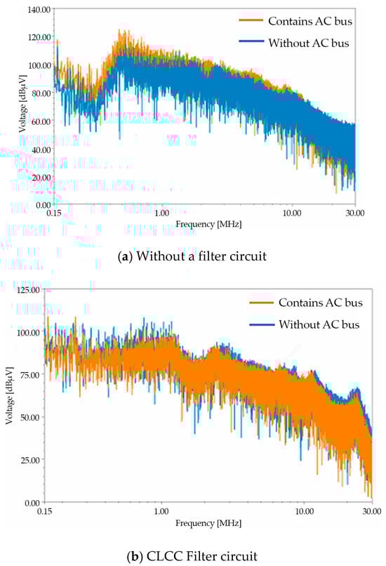 The three-phase AC module can influence EMI due to the interaction between cable impedance and semiconductor switching transients. This effect can be observed through the spectral interference curves. The three-phase AC module is a key component connecting the inverter and the motor, and it is also part of the conducted emission interference path in the EDS. However, its impact on the frequency range and extent of interference has not yet been analyzed in detail. Therefore, this paper analyzes the influence of the three-phase bus based on a complete EDS model. The specific analysis is as follows: 1. For the EDS without filtering measures, the simulation results of adding and removing the three-phase AC bus are shown in Figure 3a. In the EDS with Capacitor-Inductance-Capacitor-Capacitor (CLCC) filtering measures, the simulation results of the impact of adding and removing the three-phase bus on the conducted interference voltage spectrum (referring to the frequency distribution of voltage levels resulting from EMI that is conducted through power cables) are shown in Figure 3b.