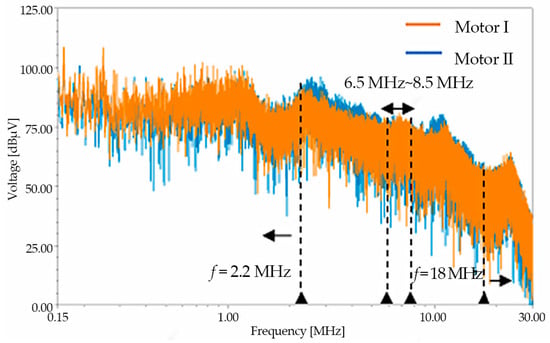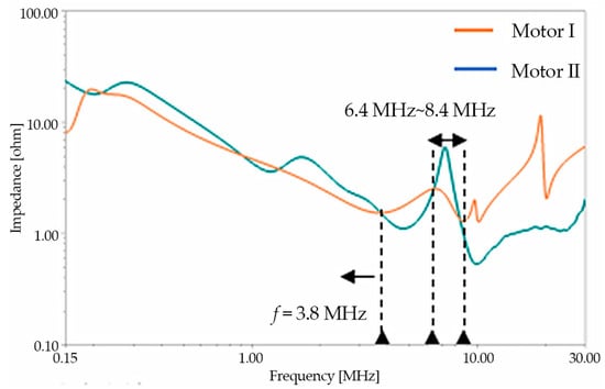 The analysis of Figure 4 and Figure 5 demonstrates that the impedance characteristics of the two motors and the conducted interference voltage spectrum exhibit distinct differences within the frequency range of 2.2 MHz to 18 MHz. Motor 2 shows higher impedance than Motor 1 in the frequency bands of 150 kHz to 3.8 MHz and 6.4 MHz to 8.4 MHz, whereas Motor 1 exhibits higher impedance in other frequency ranges. In terms of conducted interference voltage, the two motors have comparable levels in the 150 kHz to 2.2 MHz and 18 MHz to 30 MHz, while Motor 2 displays lower voltage in the 6.5 MHz to 8.5 MHz band. These findings suggest a correlation between motor impedance and conducted interference voltage, particularly in the 2 MHz to 30 MHz range. Specifically, higher motor impedance is associated with reduced interference voltage. Motor I has resonant peaks at 6.6 MHz, 9.7 MHz, and 19 MHz, with the 9.7 MHz peak attributed to the combined effects of heat sink pad capacitance, AC bus, and the motor itself. In contrast, Motor II has resonant peaks at 1.7 MHz and 7.2 MHz, but no clear correlation with the interference voltage spectrum is observed due to the masking effect of the filter’s low-impedance path. In summary, the impedance characteristics of the motor have a direct influence on the high-frequency components of the conducted interference voltage. Accurate impedance modeling is therefore crucial for predicting conducted emissions in EDS.