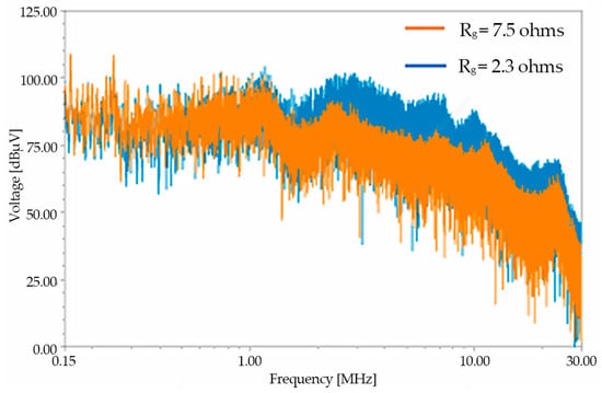 Some researchers explored the impact of IGBT internal parameters on EMI [16,17]. However, studies on the influence of external parameters, such as gate drive resistance, on the EMI of EDS are limited. Specifically, the frequency range and extent of EMI caused by drive resistance have not been fully investigated. Existing IGBT switch models are primarily based on double-pulse test data, which is effective for analyzing and modeling IGBT switching characteristics. However, the actual gate drive resistance in EDS often differs from the values used in double-pulse tests. In this study, we compared the effects of two different Gate Drive Resistances (Rg), 7.5 Ω and 2.3 Ω, on the conducted interference voltage of the system (as shown in Figure 6).
