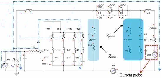 An equivalent analysis model of the key-loop impedance characteristics of the EDS, including the filtering circuit, is constructed, as shown in Figure 7. This model ensures that the current characteristics of the branch with a 50 Ω load are positively correlated with the voltage characteristics of the conducted emission interference in the EDS. By controlling and optimizing the filter parameters in the key path impedance characteristic equivalent model, the proposed technique enables risk prediction of the conducted emission interference voltage and its suppression. The key parameter for evaluating the effectiveness of the filter parameters in interference suppression is the current characteristic curve measured by the probe in the 50 Ω load branch.