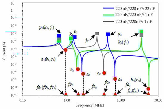 The 220 nF Y-capacitor in the single branch of Zseries generates resonant points a1, b1, and c1, with corresponding resonant frequencies fa1 = fb1 = fc1 = 900 kHz. These capacitors also generate resonant risk points p1, k1, and j1, with corresponding frequencies of 830 kHz.