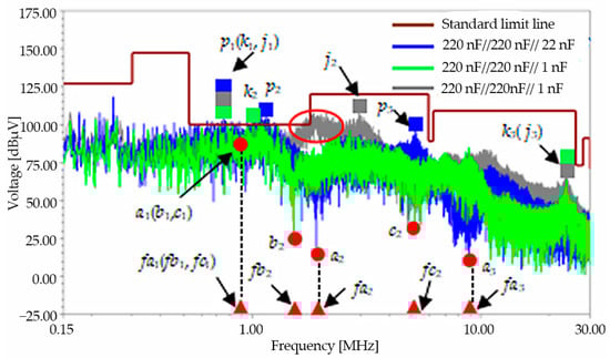 Where a1, a2, a3, b1, b2, b3, c1, c2, and c3 represent resonant points, while fa1, fa2, fa3, fb1, fb2, fb3, fc1, fc2, and fc3 represent the corresponding resonance frequencies of these points, p1, p2, p3, k1, k2, k3, j1, j2, and j3 indicate the resonance risk points, that is, the points that may cause the conducted interference voltage of the system to exceed the standard limit curve.