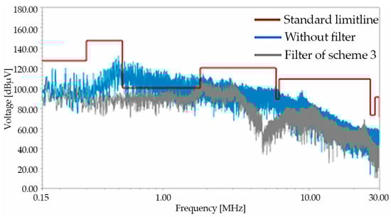 Figure 10 illustrates the effectiveness of Scheme 3 by incorporating its filter parameters into the conducted interference voltage simulation model depicted in Figure 1. The simulation data were compared against the interference voltage levels observed without filtering. The introduction of Scheme 3 significantly reduces the interference voltage levels within the critical frequency bands where the unfiltered system exceeds regulatory limits. Specifically, in the 0.53–1.8 MHz band, the interference voltage is reduced by up to 28 dBμV, and in the 5.9–6.2 MHz band, the reduction is as much as 26 dBμV. These results underscore the filter’s effectiveness in not only diminishing overall EMI but also shifting resonance frequencies to less critical regions, thereby enhancing the system’s electromagnetic compatibility.