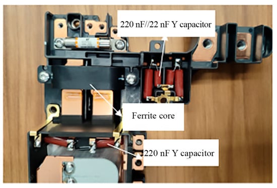 The analysis of key modules in the EDS indicates that EMI is strongly influenced by motor impedance and IGBT drive settings. However, the impact of the AC module and motor impedance on the frequency bands that exceed the standard limits in this study is relatively minor. While increasing the gate resistor can reduce the interference voltage in the frequency band of 5.9–6.2 MHz, it also decreases switching efficiency and increases switching losses of the device. These modules are therefore unable to optimize the frequency bands that exceed the standard limits as discussed in Section 2.1. Consequently, to bring the conducted voltage in Section 2.1 into compliance with Level 3 limits, the next section will employ filters to suppress interference in specific frequency bands.