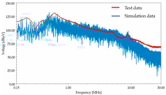 As shown in Figure 11, the simulation and measured data of conducted interference voltage for the EDS without filtering are highly consistent, with frequency errors of risk points and resonant points less than 1 MHz and amplitude errors less than 3 dBμV. Together with the relationship between the simulation curves and the limit standards shown in Figure 5, this verifies that the model established in this paper can accurately predict the conducted interference risk of the EDS.
