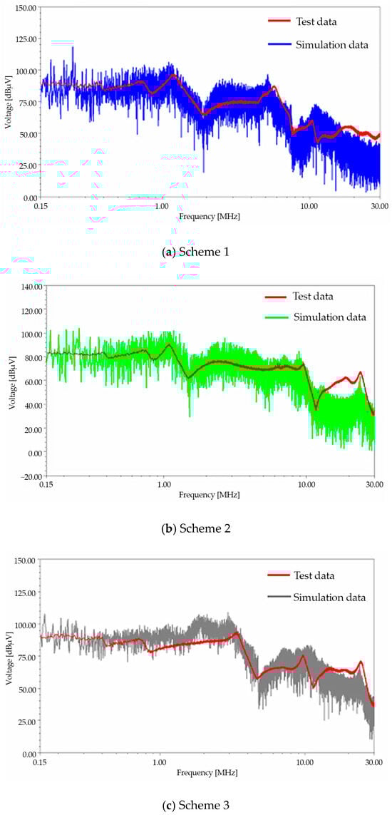 Based on the test, emission tests were completed under high-voltage conditions without filtering and with three different filter parameters. The filter circuit is located between the IGBT port and the DC bus port, using a CLCC capacitor-bead-capacitor filter architecture. Due to space limitations, the analysis mainly focuses on three combinations of Y capacitor filter parameters: Scheme 1, Scheme 2, and Scheme 3. Four sets of measured conducted emission interference voltage spectrum data were obtained and compared with the simulated voltage under the same conditions, as shown in Figure 13 and Figure 14a–c.
