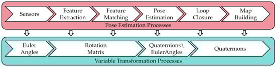 In summary, within SLAM algorithms, translational variables are represented using rectangular coordinates, while rotational variables are represented using Euler angles, rotation matrices, or quaternions. As discussed in the previous section, the state-of-the-art (SOTA) frameworks for 3D Lidar SLAM are ALOAM and LIO-SAM. Their pose estimation processes and rotational variable transformation processes are illustrated in Figure 2.
