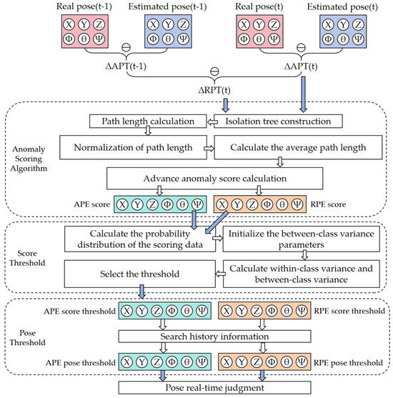 To avoid the dependency of the aforementioned detection algorithms on the environment, anomalies are analyzed based on the estimated pose result data. There are many reasons for abnormal positioning, but ultimately, they are all reflected in the output estimation posture of the system. The output estimation pose has the nature of timing, and the abnormal detection methods of time series data are commonly used as follows. Dani et al. [27] utilized a statistical approach, employing standard deviation to determine thresholds. This method is computationally simple but requires specific data distribution assumptions. Huang et al. [28] adopted a method based on LOF (local outlier factor ) density estimation, which is suitable for complex datasets but has high computational complexity. Xiaoyu et al. [29] used the DBSCAN (density-based spatial clustering of applications with noise) clustering algorithm, which can identify irregular datasets, but requires the selection of artificial parameters. Ehsan et al. [30] used a combination of deep recurrent neural network (RNN) and long short-term memory (LSTM) to detect the time series data, and adopted a particle swarm optimization algorithm to segment the threshold. This method has been accurately verified in a variety of supervised scenarios. However, this method requires labeled datasets and sufficient early training, and the requirements for datasets and application hardware are too high to be correspondingly lightweight. They also improve the confidence of the algorithm by using injected false information, which can detect transient anomalies, but it is not suitable for slam, which is a long-term response to ambient and sensor noise, because it can cause the model to adapt to noise and cannot be detected [31]. Isolated forest has the advantages of real time, low algorithm complexity and unsupervised lightweight, which can get rid of the dependence on labeled data and hardware computing power, and adapt to edge deployment. It also has dynamic robustness, which can resist environmental mutations through random partitioning and avoid model overfitting noise. However, the grading rules need to be set manually [32].