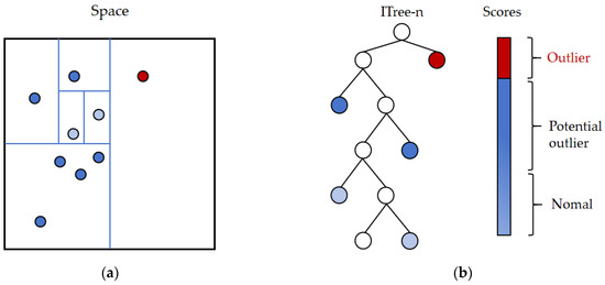 The isolation forest (iForest) employs a highly efficient strategy, utilizing a random hyperplane to split the data, generating two subspaces with each cut. This process continues with each subspace being further split by another random hyperplane, iterating until only one data point remains in each subspace [32]. Intuitively, dense clusters require many cuts to cease splitting, whereas sparse points quickly become isolated in a subspace. The iForest algorithm benefits from the concept of random forests; much like random forests consist of numerous decision trees, the iForest consists of numerous binary trees, known as isolation trees (iTrees). The construction of iTrees differs from that of decision trees and is simpler, involving a completely random process. The strategy of the algorithm is illustrated in Figure 5.