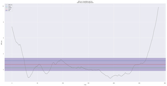 Absolute trajectory error (ATE) can directly reflect the positioning accuracy and map construction quality of the system in different scenarios. The absolute attitude error (APE) is calculated as the Euclidean distance between the system’s estimated attitude and the reference attitude, requiring that the timestamps between the system and the reference result be aligned to reflect the performance of the system.