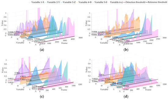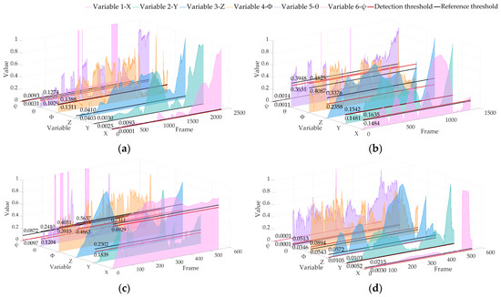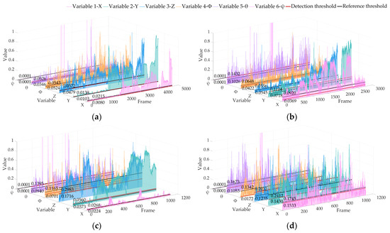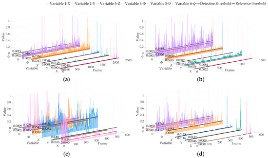 Locating abnormal RPE detection results based on the KITTI dataset of LIO-SAM. The red line is the detection threshold, and the black line is the reference threshold: (a) 02 sequence; (b) 05 sequence; (c) 06 sequence; (d) 07 sequence.