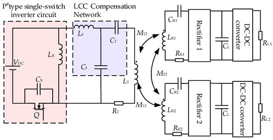 The circuit structure of a single-transmitter dual-receiver WPT system based on the P#-type LCC-S compensation network is shown in Figure 1. In this system, VDC is the input DC voltage of the single-switch resonant inverter, Q is the power MOSFET, LF is the compensation inductor at the transmitter side, CF is the parallel compensation capacitor at the transmitter side, LT is the transmitter coil inductance, CT is the series compensation capacitor at the transmitter side, LF, CF, CT, and LT constitute the LCC compensation circuit at the transmitter side, RT is the internal resistance of the transmitter coil, LX is the resonant inductor, CX is the resonant capacitor, M is the mutual inductance between the coils, LRn (n = 1, 2) is the inductance of the receiver coils, RRn (n = 1, 2) is the internal resistance of the receiver coils, CRn (n = 1, 2) is the compensation capacitor of the receiver coils, CL is the output filter capacitor, and RL is the load resistance. Each rectifier is followed by a cascaded DC-DC converter to stabilize the output voltage and maintain stable output power.