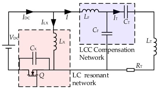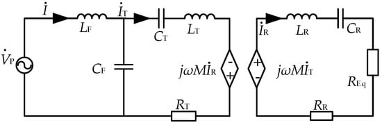 From the literature [16], the single-switch resonant inverter outputs an AC voltage that can be equated with an AC voltage source Vp. The equivalent circuit of the single coil compensation network is shown in Figure 3, where M is the mutual inductance between the transmitting and receiving coils.