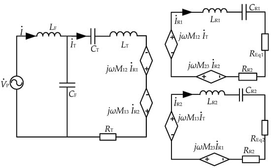 Equation (8) extends the resonance conditions described in Equation (5) to accommodate multiple receivers (i = 1, 2). The inductance LRi and capacitance CRi of each receiver meet the same resonance condition, ensuring that all receivers operate at the same resonant frequency ω. This synchronization not only enhances the overall power transfer efficiency and voltage stability across multiple receivers but also reduces potential interference among receivers, maintaining the stability and reliability of the system.