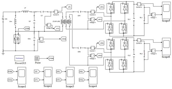 Step 7: Voltage and Current Measurement with Waveform Analysis. Voltage and current measurement modules are used to monitor the operating status at key nodes of the system. A scope oscilloscope is utilized for waveform observation, with specific monitoring assignments as follows: Scope1 monitors the PWM signal and the drain-source voltage VGS, Scope2 monitors the transmitter coil voltage VT and current IT, Scope3 monitors the rectifier input voltage VR1 and current IR1 at Receiver 1, Scope4 monitors the rectifier input voltage VR2 and current IR2 at Receiver 2, Scope5 monitors the output voltage VO1 and current IO1 at Receiver 1, and Scope6 monitors the output voltage VO2 and current IO2 at Receiver 2. Finally, by analyzing the measured waveforms, the operational characteristics of the WPT system are evaluated, and the effectiveness of the proposed design is verified.