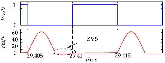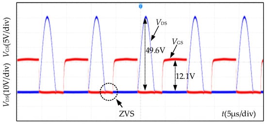 Figure 20 shows the soft-switching waveforms of the single-switch inverter switch Q. Before the gate drive signal VGS of the switch transitions from low to high, the drain-source voltage VDS of the switch has already dropped to zero. When the gate drive signal goes high, the switch Q achieves zero-voltage switching (ZVS).