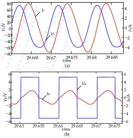 Simulation model working waveform. (a) Transmitter current and voltage waveforms. (b) Receiver current and voltage waveforms.