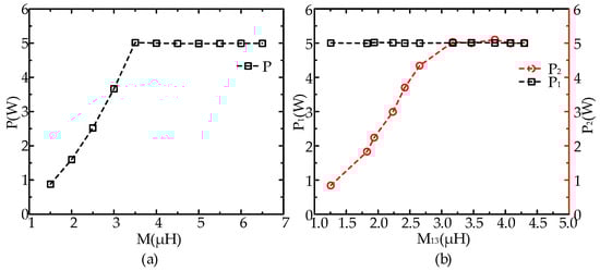 The output power from simulations with different values of mutual inductance is shown in Figure 8. Figure 8a shows the output power of the system with different mutual inductances when the receiving coil is misaligned in a one-to-one system. Figure 8b shows the output power of the system under different mutual inductances in a one to two system, where M13 is the mutual inductance between the transmitting coil and the receiving coil 2, P2 denotes the power of the load on the receiving coil 2, and P1 denotes the power of the load on the receiving coil 1.
