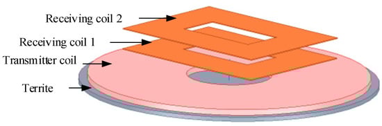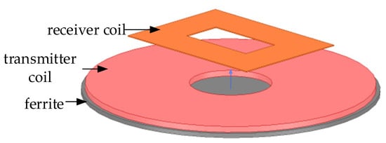 The single-transmitter and single-receiver WPT structure is shown in Figure 9. According to the Qi standard, the receiving coil is a rectangular hollow coil 40 mm in length and 30 mm in width to improve the space utilization, and the transmitting coil is a circular coil with a larger area than the receiving coil to increase the magnetic field strength, with a diameter of 70 mm.